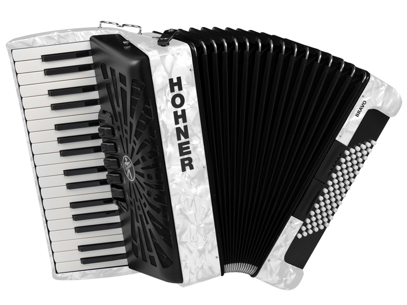 Piano-Akkordeon, Silent Key, Farbe: Weiß, 34 Tasten, Chöre im Diskant: 3, 5 Diskantregister, 72 Bässe, Chöre im Bass: 4, 2 Bassregister, Maße in cm: ca. 39,4 x 18,5, neues Design: Registerdrücker in Schwarz, Verdeck-Gaze in Schwarz