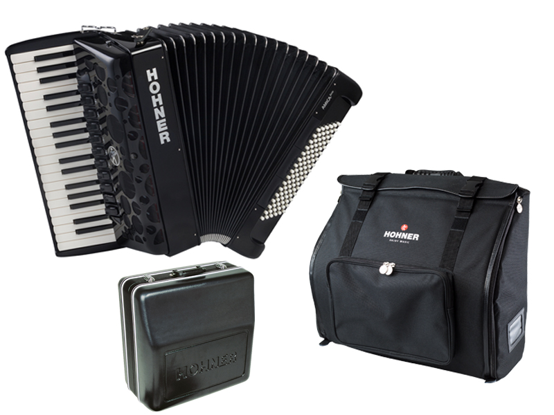 Piano Akkordeon, neues Silent Key Modell, Stimmplatten-Upgrade, Farbe: Schwarz, 37 Tasten, Chöre im Diskant: 4, 11 Diskantregister, 96 Bässe, Chöre im Bass: 4, 3 Bassregister, Gewichte: ca. 9,1 kg, Inkl. Gigbag, Koffer und Tragriemen