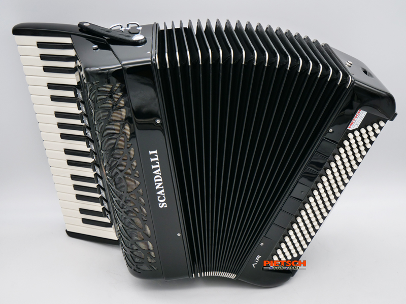Piano-Akkordeon, Farbe: Schwarz, Mit Cassotto, HA1-Stimmplatten, 37 holzgelagerte Tasten, Chöre im Diskant: 4, 11 Diskantregister, 1 Griffstabregister, 120 Bässe , Chöre im Bass: 5, 7 Bassregister, Maße in cm: 42,5 x 19 x 43, Gewicht: 9,9 kg