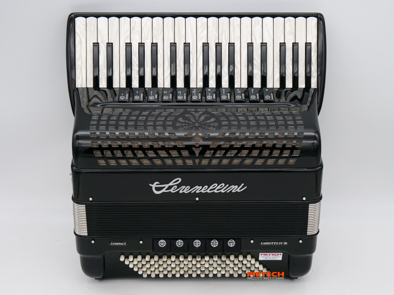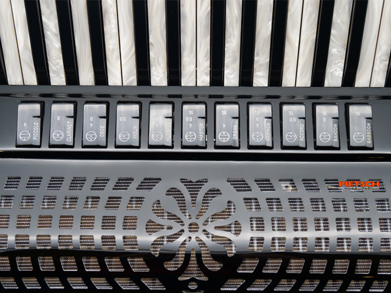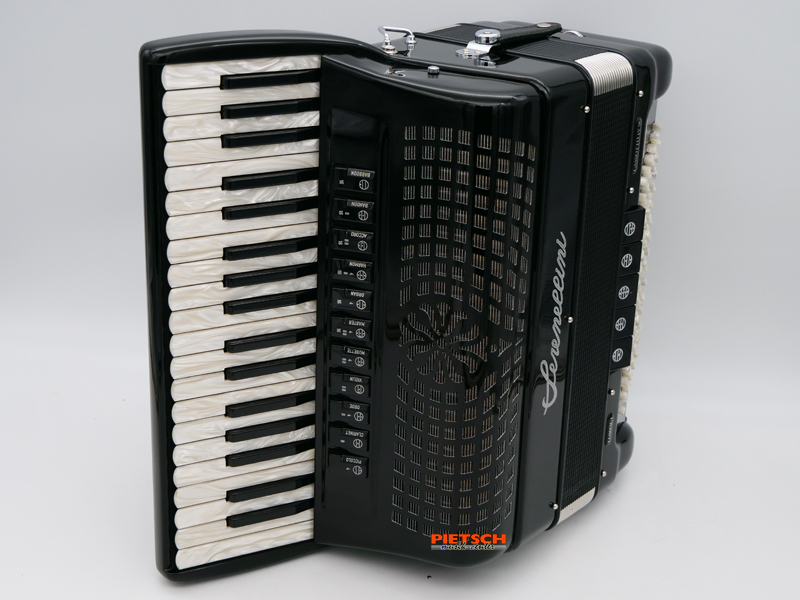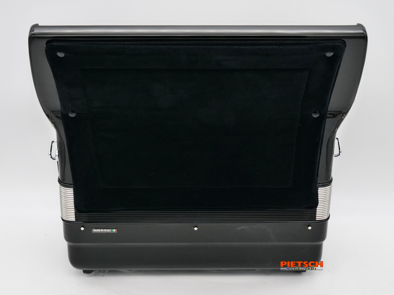 Piano Akkordeon, Farbe: Schwarz, Mit Cassotto, HA2-Stimmplatten, 37 holzgelagerte Tasten, Chöre im Diskant: 4, 11 Diskantregister, 108 Bässe, Chöre im Bass: 5, 5 Bassregister, Doppeloktav Stimmung ( 16″+8″+8″+4″), Inkl. Koffer und Tragriemen
