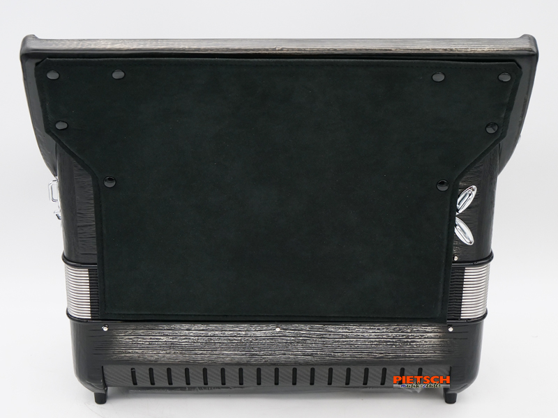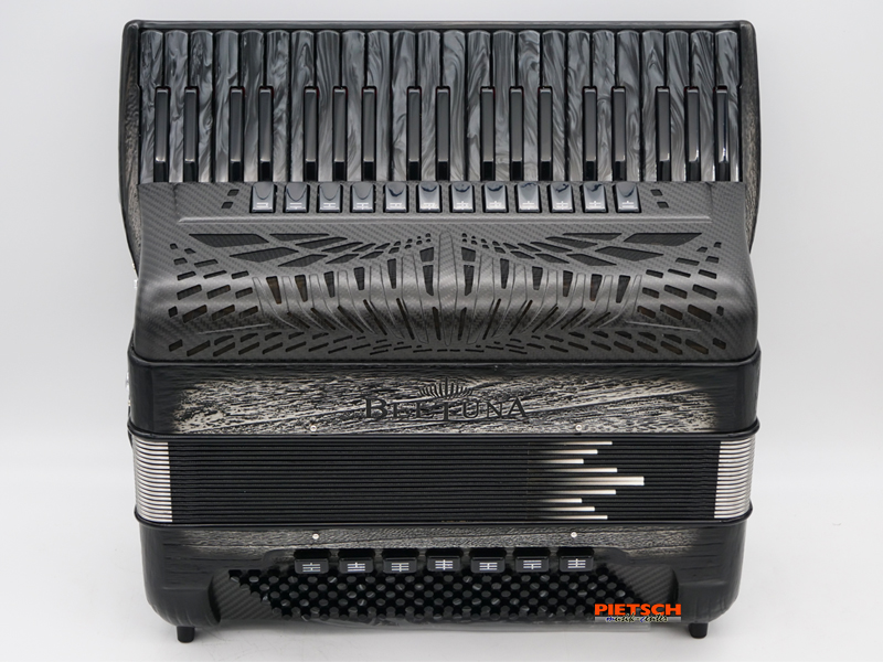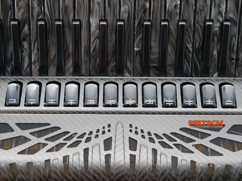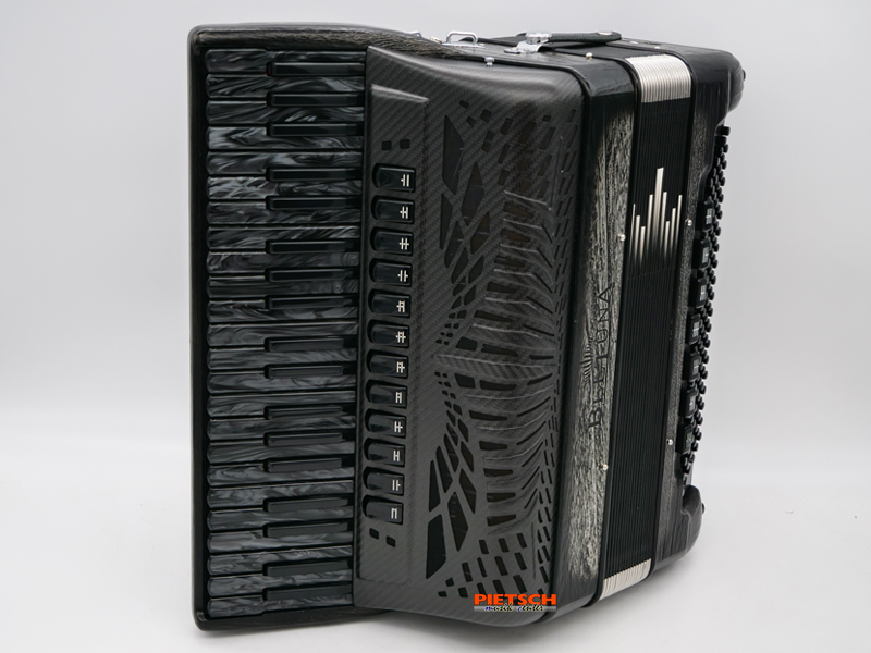 Piano Akkordeon, Farbe: Platinum Carved, Compact Modell, FLY Ausführung, Tastatur in Schwarz Perlmutt, Mit Cassotto, GHV Stimmplatten, 41 holzgelagerte Tasten, Chöre im Diskant: 4, 12 Diskantregister, 120 Bässe, Chöre im Bass: 5, 7 Bassregister