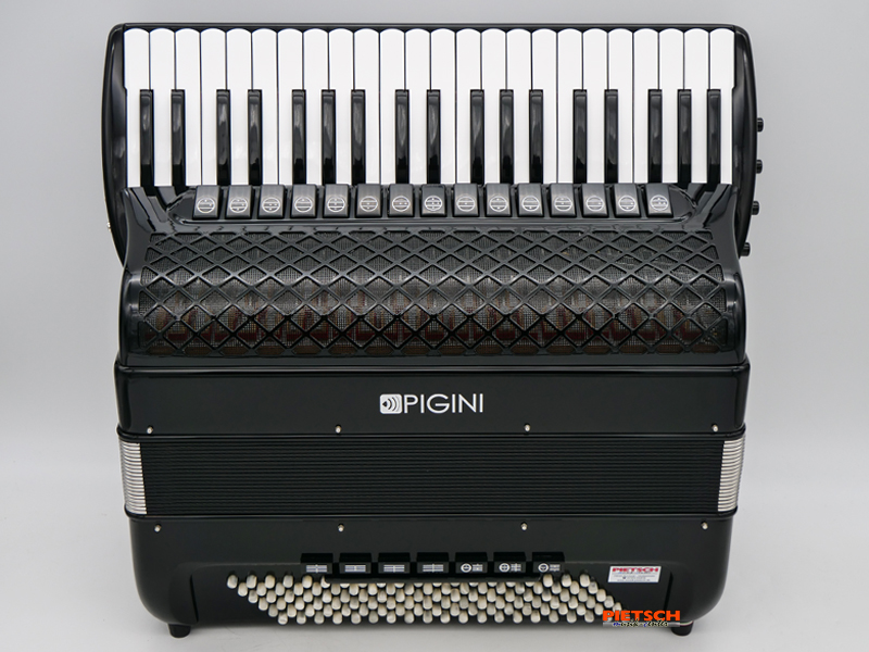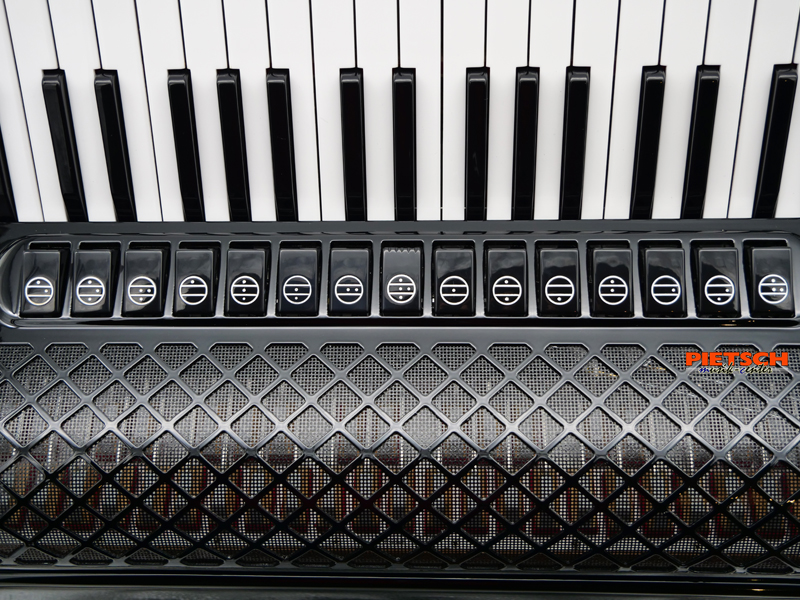Piano Convertor Akkordeon, Farbe: Schwarz, Mit Cassotto, HA1-Stimmplatten, 41 holzgelagerte Tasten, Chöre im Diskant: 4, 15 Diskantregister, 4 Kinnregister, 120 Bässe, Chöre im Bass: 6, 7 Bassregister, 55 Melodiebässe, Chöre im Melodiebass: 2