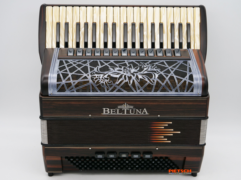 Piano Akkordeon Volkstümlich, Farbe: Ebenholz, Mit Cassotto, 38 holzgelagerte Tasten, Chöre im Diskant: 5, 13 Diskantregister, Volkstümliche Stimmung (16″+8″+8″+8″+4″), 120 Helikonbässe umschaltbar, Chöre im Bass: 4, 5 Bassregister, Maße in cm: ca. 45×22