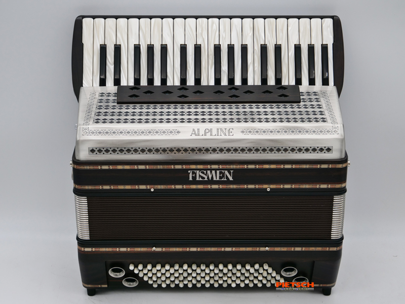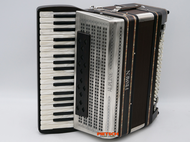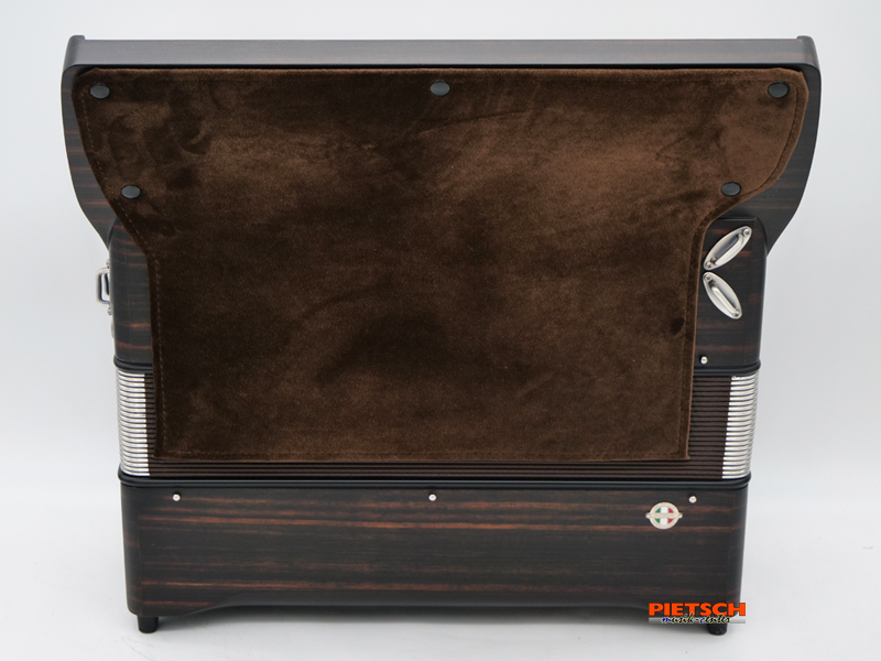 Piano Akkordeon, Farbe: Ebenholz Matt, 37 holzgelagerte Tasten, Super Durall – Stimmplatten, Beschlagsteile in Altsilber, Chöre im Diskant: 3, spezielle Anordnung der Diskantklappen, 96 Helikonbässe, Inkl. Koffer und Tragriemen