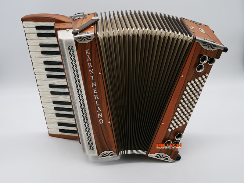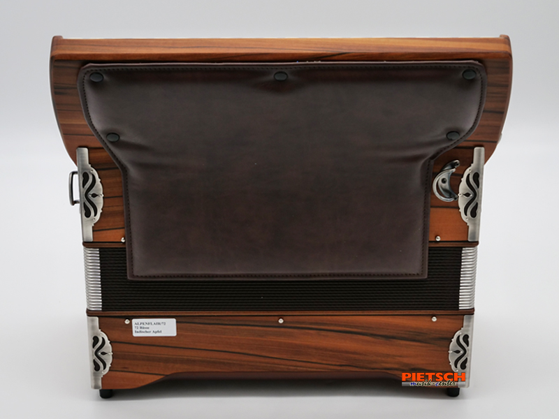 Piano Akkordeon, Farbe: Indischer Apfel, seidenmatt lackiert, 34 holzgelagerte Tasten, Chöre im Diskant: 3, 1A-Konzertstimmzungen, 72 Helikonbässe, Volkstümliche Registration (8+8+8) Musette Stimmung, großer Dynamikbereich,