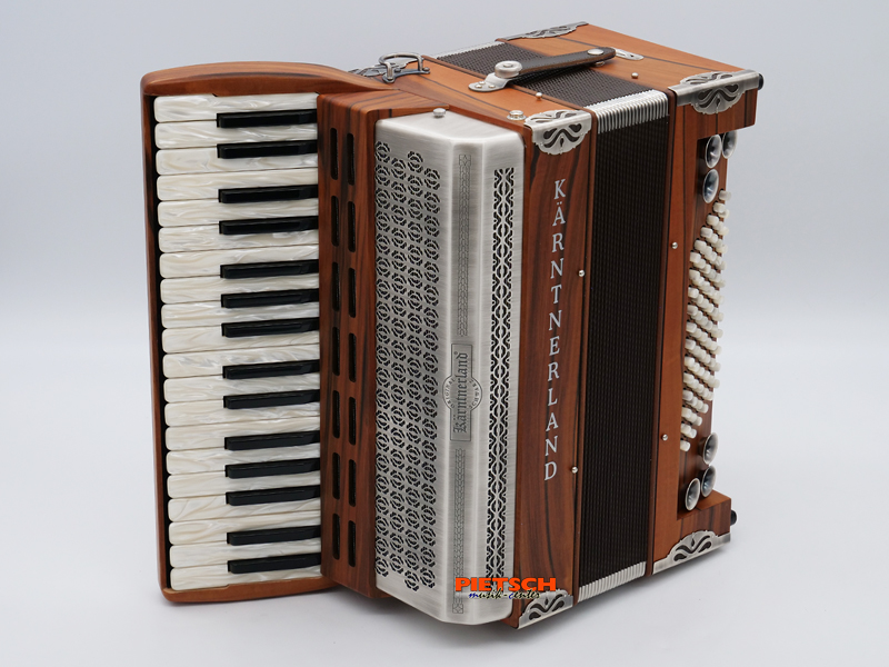 Das Akkordeon mit dem Klang einer Steirischen! Das neueste Akkordeon aus dem Hause Schwarz besticht durch die einzigartige Optik und den wundervoll kräftigen Klang, der einer Steirischen Harmonika sehr nahe kommt. In Verbindung mit den starken Helikon-Bässen entstand ein ganz besonderes Akkordeon. Dabei sind die 3-chörigen Diskantklappen wie bei der "Steirischen" angeordnet. Auf Grund der einmaligen Leichtbauweise wurde sowohl an der Melodie als auch an der Bassseite auf Register verzichtet. Indisches Apfelholz in seidenmatter Optik gepaart mit Altsilber-Beschlägen verleihen diesem Akkordeon ihre ganz spezielle Natürlichkeit. Das besonders leichte Gewicht von knapp 9 kg garantiert höchsten Spielgenuss!