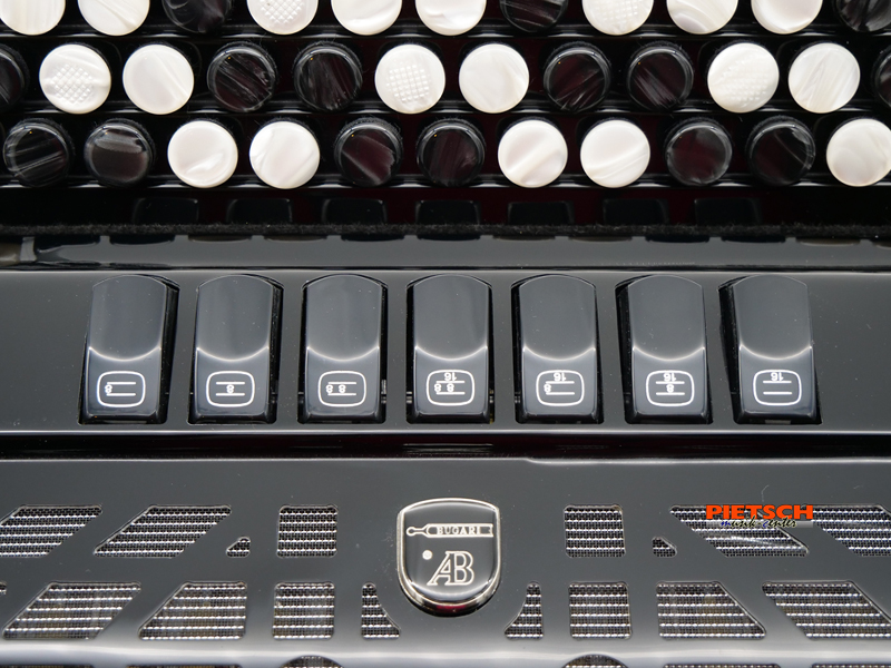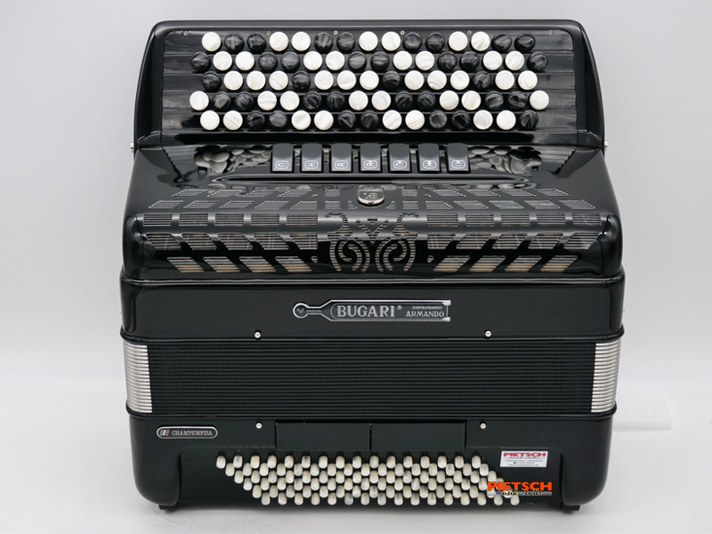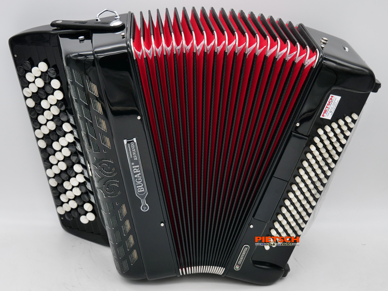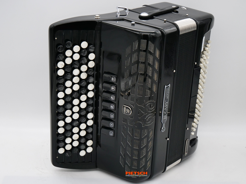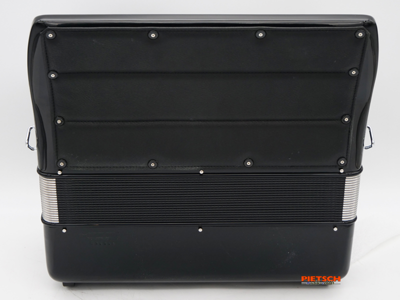 Knopfakkordeon, Farbe: Schwarz, C-Griff, Tipo a mano Stimmplatten, 5-reihig, 77 Diskantknöpfe (41 Töne), Chöre im Diskant: 3, 7 Diskantregister, 16″+8″+8″ – Registration, 96 Bässe, Chöre im Bass: 4, 2 Bassregister, Maße in cm: ca. 41,5 x 39 x 19