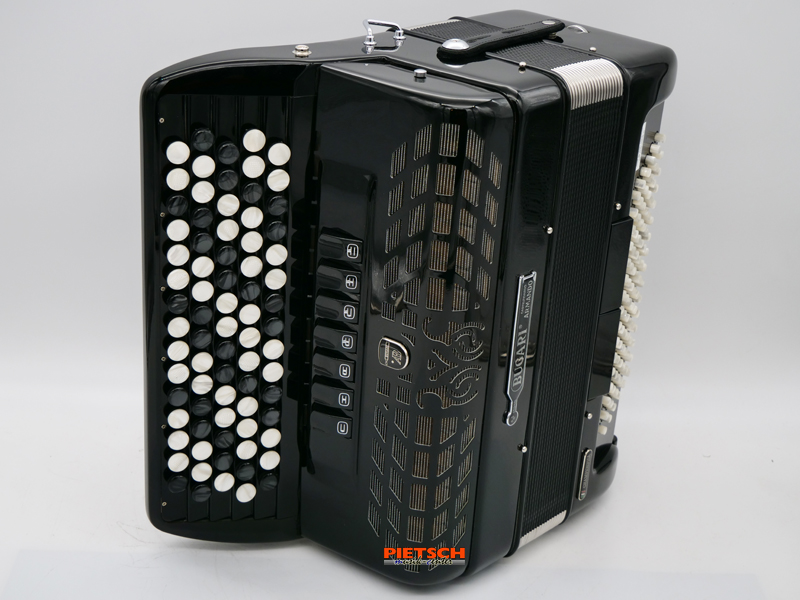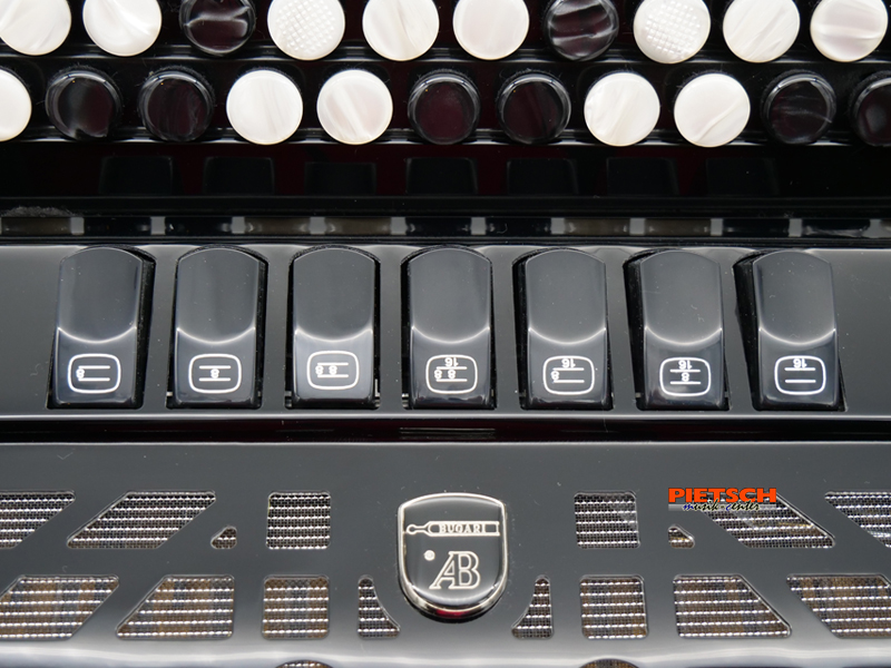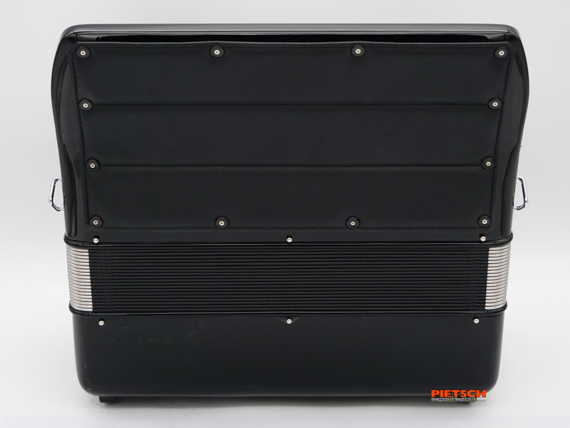 Knopfakkordeon, Farbe: Schwarz, B-Griff, Super Durall Stimmplatten, 5-reihig, 77 Diskantknöpfe (41 Töne), Chöre im Diskant: 3, 7 Diskantregister, 16″+8″+8″ – Registration, 96 Bässe, Chöre im Bass: 4, 2 Bassregister, Maße in cm: ca. 41,5 x 39 x 19