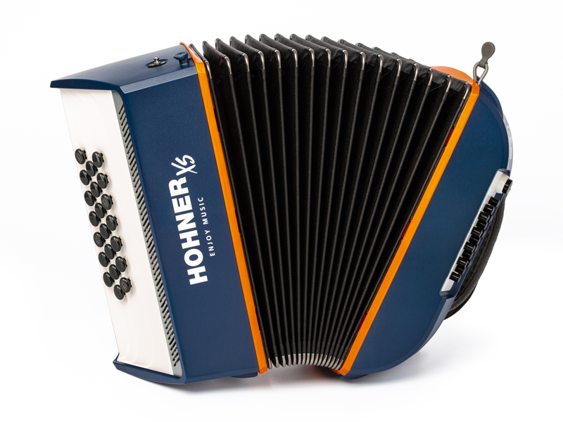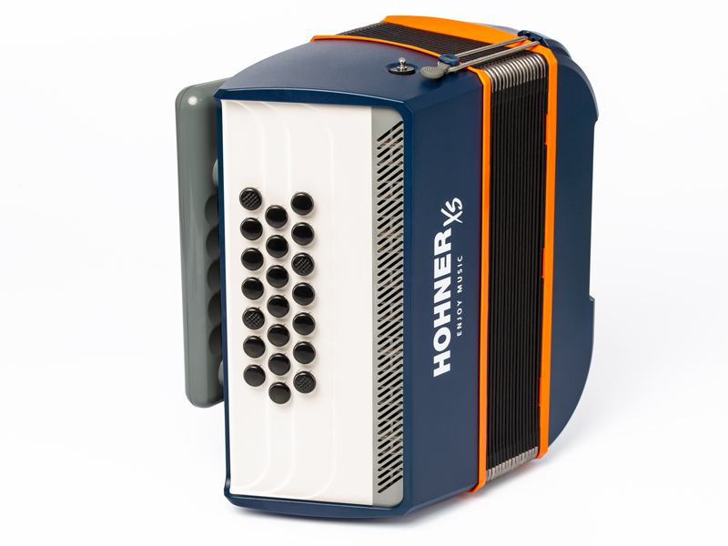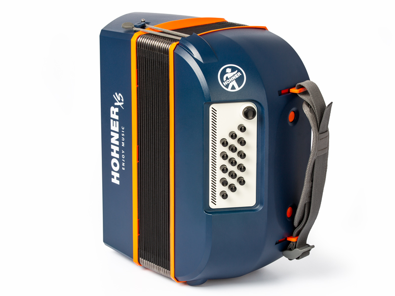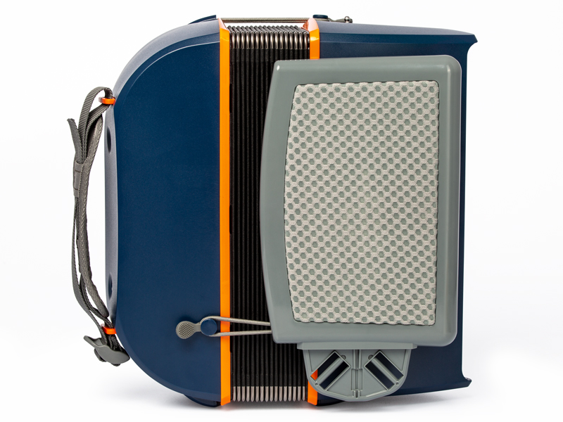 Kinder Knopf Akkordeon, C-Griff, besonders leicht gebaute, ergnomische Konstruktion, 21 Diskantknöpfe in 3 Reihen, Chöre im Diskant: 1, 15 Bässe, Chöre im Bass: 2, Farbe: blau-orange, inkl. Gigbag und Tragriemen für Kinder