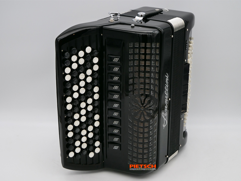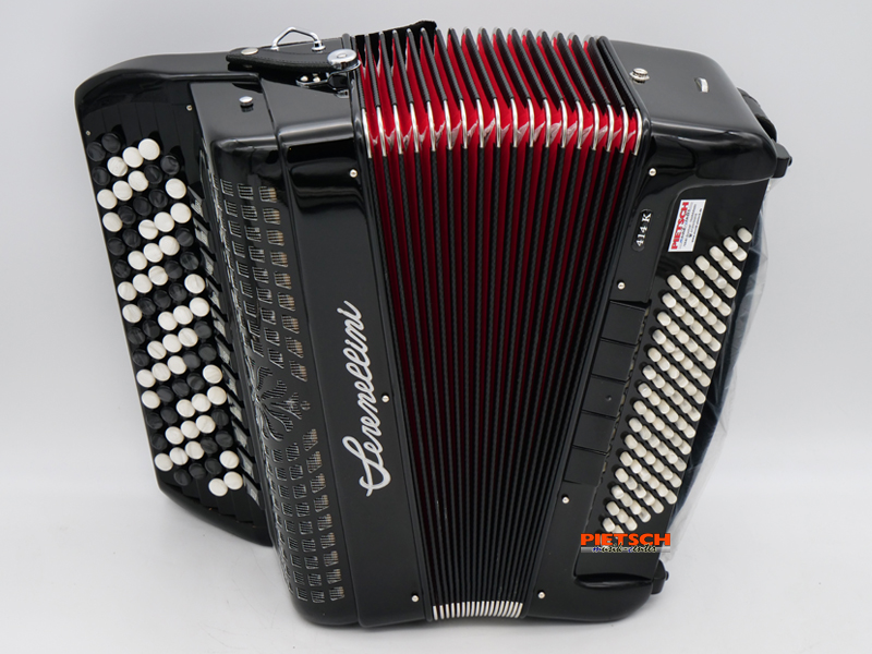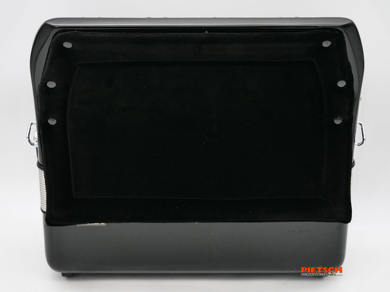 Knopfakkordeon, Farbe: Schwarz, C-Griff, Tipo a Mano Stimmplatten, 5-reihig, 77 Diskantknöpfe (41 Töne), Chöre im Diskant: 4, 11 Diskantregister, 96 Bässe, Chöre im Bass: 5, 5 Bassregister, Maße in cm: ca. 39,5 x 42 x 18,5, Gewicht: ca. 9,5 kg