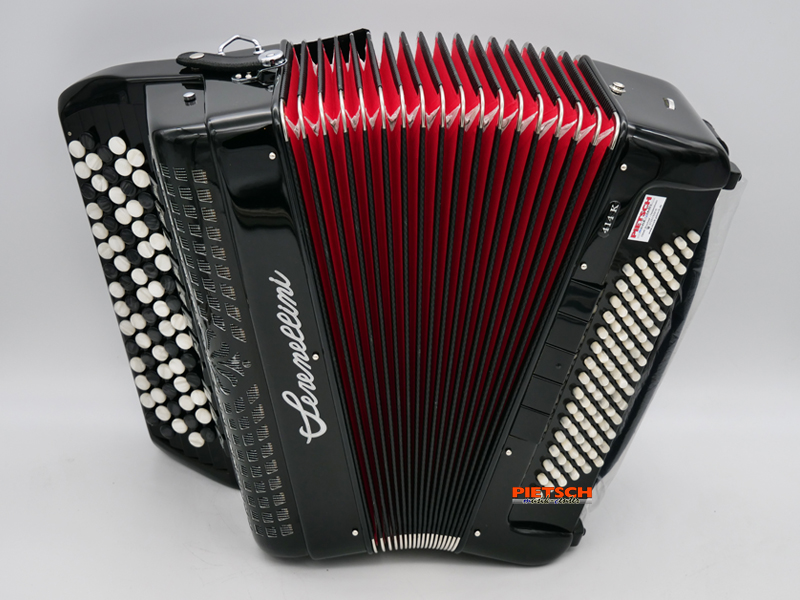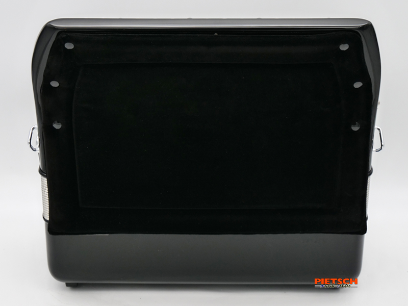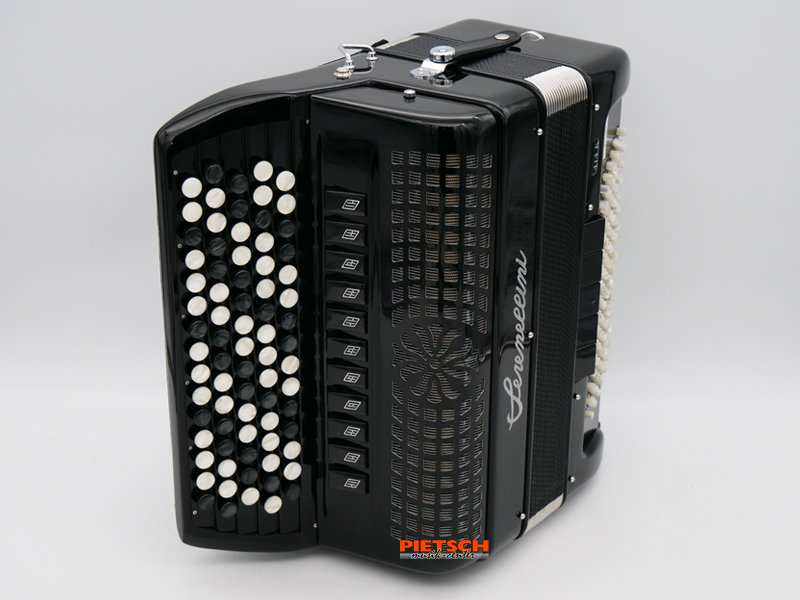 Knopfakkordeon, Farbe: Schwarz, B-Griff, Tipo a Mano Stimmplatten, 5-reihig, 77 Diskantknöpfe (41 Töne), Chöre im Diskant: 4, 11 Diskantregister, 96 Bässe, Chöre im Bass: 5, 5 Bassregister, Maße in cm: ca. 39,5 x 42 x 18,5, Gewicht: ca. 9,5 kg
