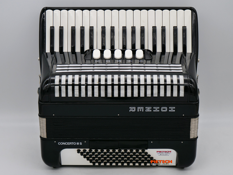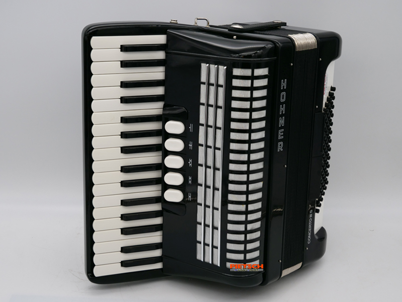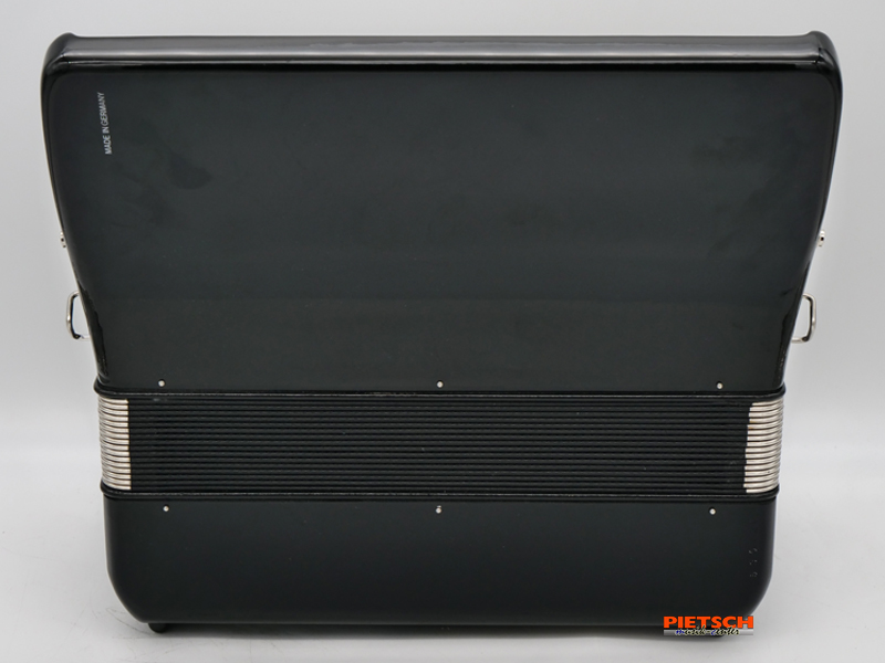 Piano Akkordeon, Farbe: Schwarz, Gebraucht, guter Zustand, Überarbeitet und gestimmt, 34 Tasten, Chöre im Diskant: 3, Diskantregister: 5, 72 Bässe, Chöre im Bass: 4, 2 Bassregister, Maße in cm: ca. 39,4 x 18,5, Gewicht: handgewogen ca. 6,75 kg