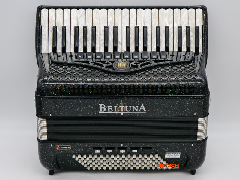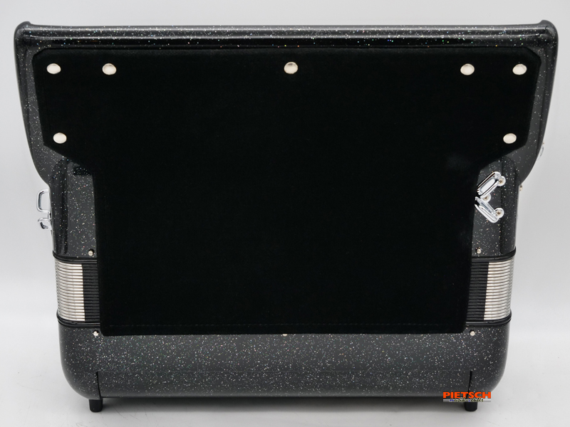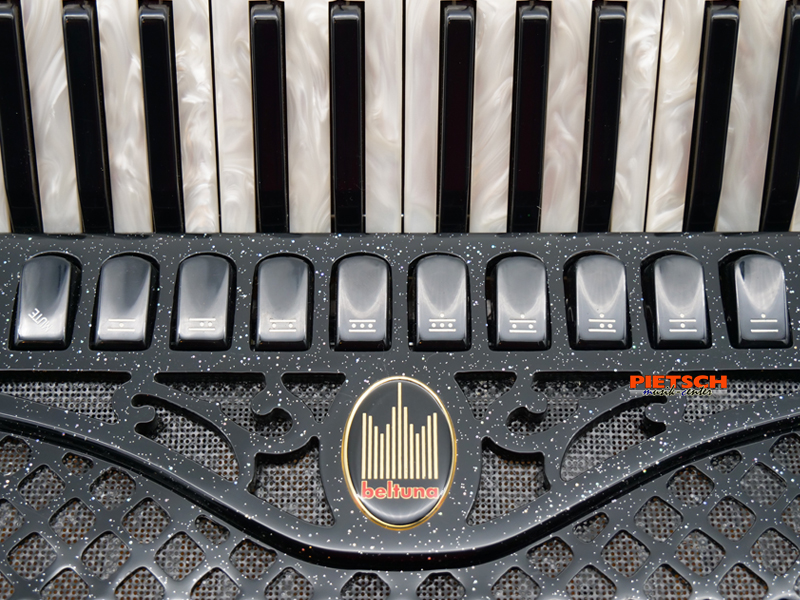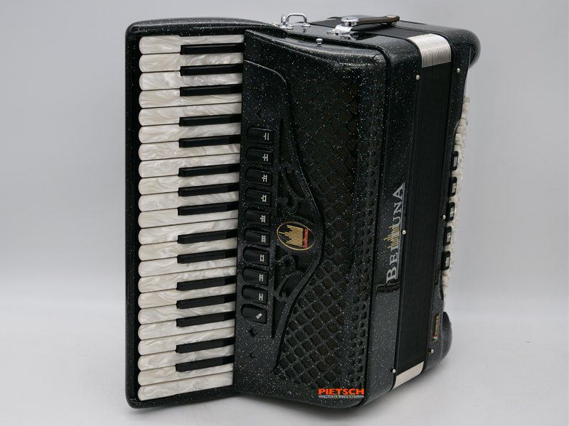 Piano Akkordeon, Gebraucht, Sehr guter Zustand, Farbe: Schwarz-Metallic, Super Durall Stimmplatten, 37 holzgelagerte Tasten, Chöre im Diskant: 4, 10 Diskantregister, Stimmung (16″+8″+8″+8″), 96 Bässe, Chöre im Bass: 5, 5 Bassregister