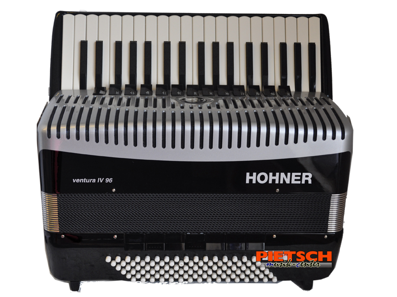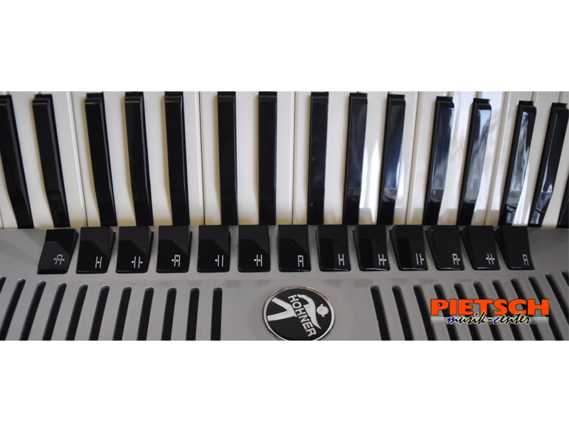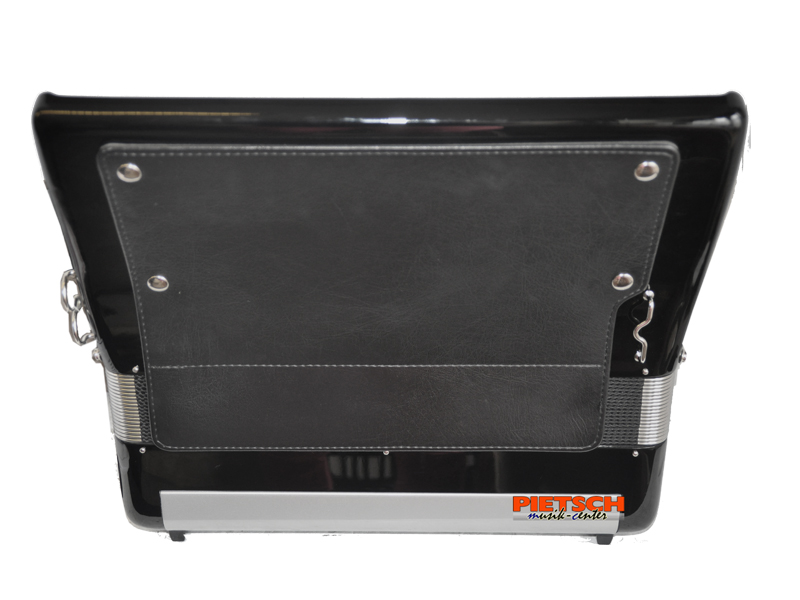 Piano Akkordeon, Gebraucht, Sehr guter Zustand, Farbe: Schwarz/Silber, 37 holzgelagerte Tasten, Chöre im Diskant: 4, 13 Diskantregister, 96 Bässe, Chöre im Bass: 5, 7 Bassregister, Gewicht: 10,4kg, Maße in cm: 45,6×19, Inkl. Gigbag und Tragriemen