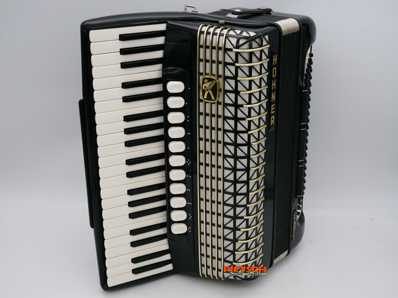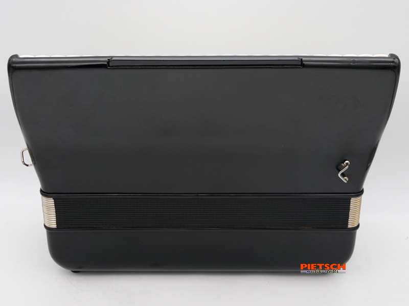 Piano Akkordeon, Farbe: Schwarz, Gebraucht, sehr guter Zustand, 41 Tasten, Chöre im Diskant: 4, 11 Diskantregister, Doppeloktav-Stimmung, 120 Bässe, Chöre im Bass: 4, 3 Bassregister, Gewicht: ca. 11 kg, Maße in cm: 48 x 18,5, inkl. Koffer und Tragriemen