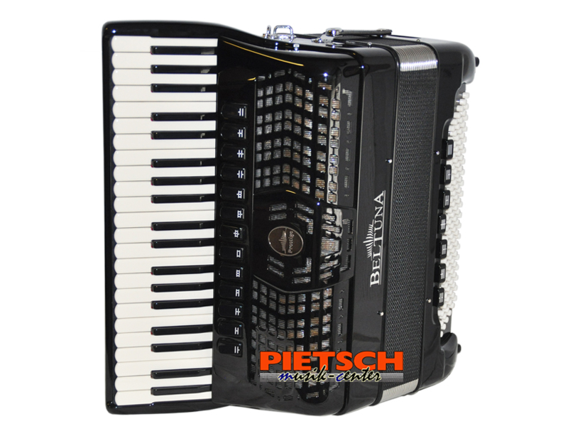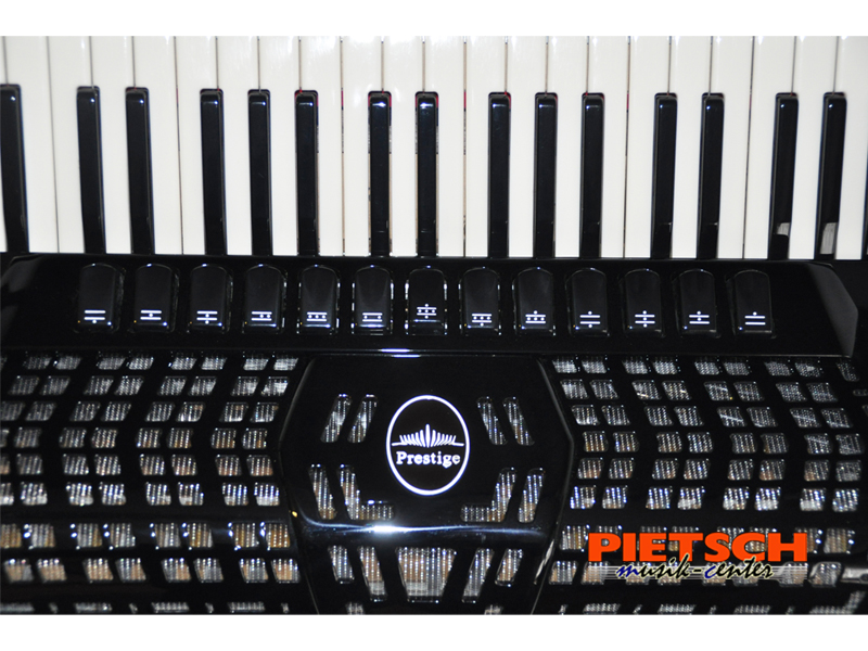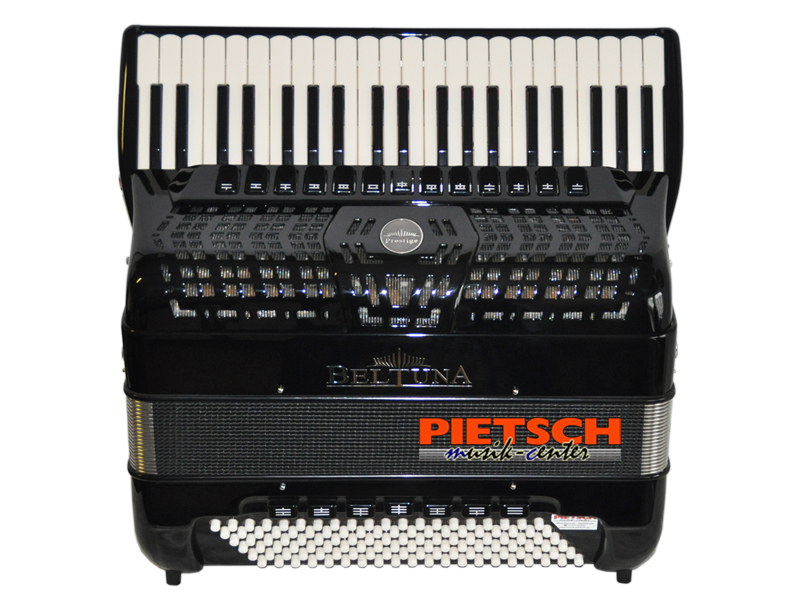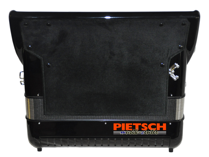 Piano Akkordeon, Gebraucht, Top Zustand, Farbe: Schwarz, Compacte Bauweise, Mit Cassotto, GHV-Stimmplatten, 41 holzgelagerte Tasten, Chöre im Diskant: 5, 13 Diskantregister, Registrierung (16″+8″+8″+8″+4″), 120 Bässe, Chöre im Bass: 5, 7 Bassregister