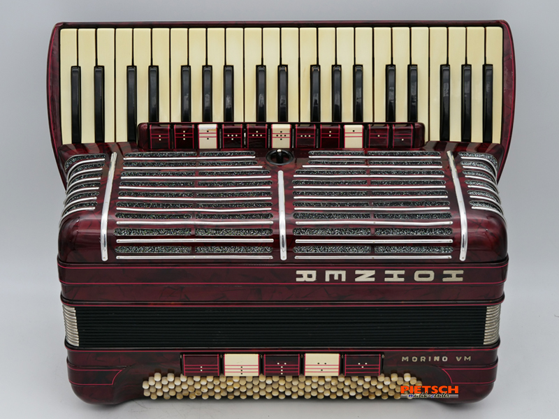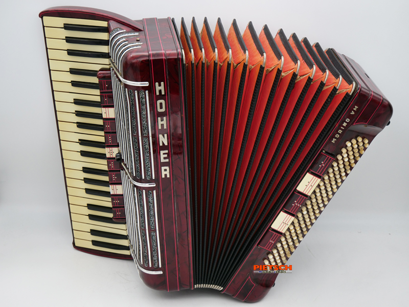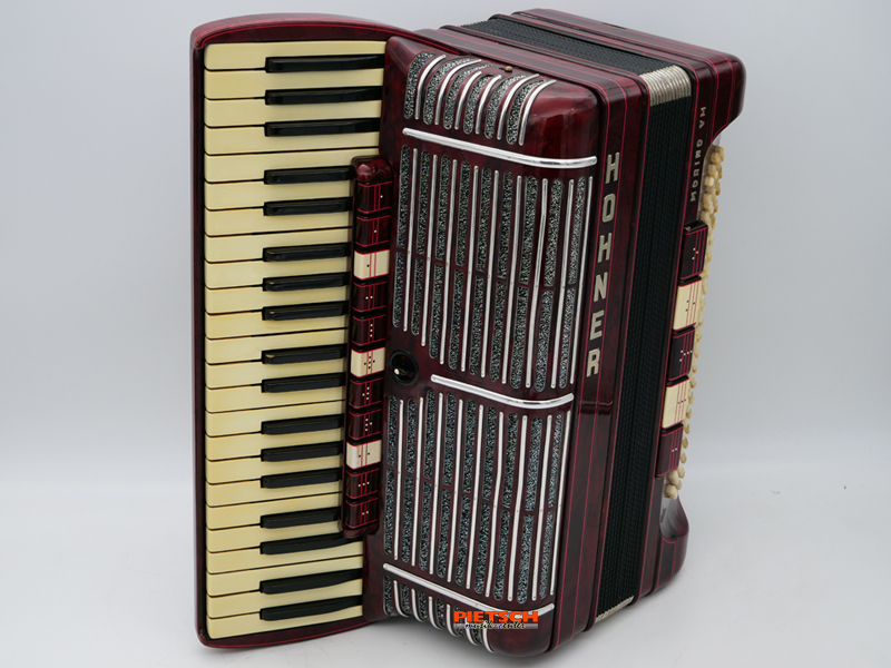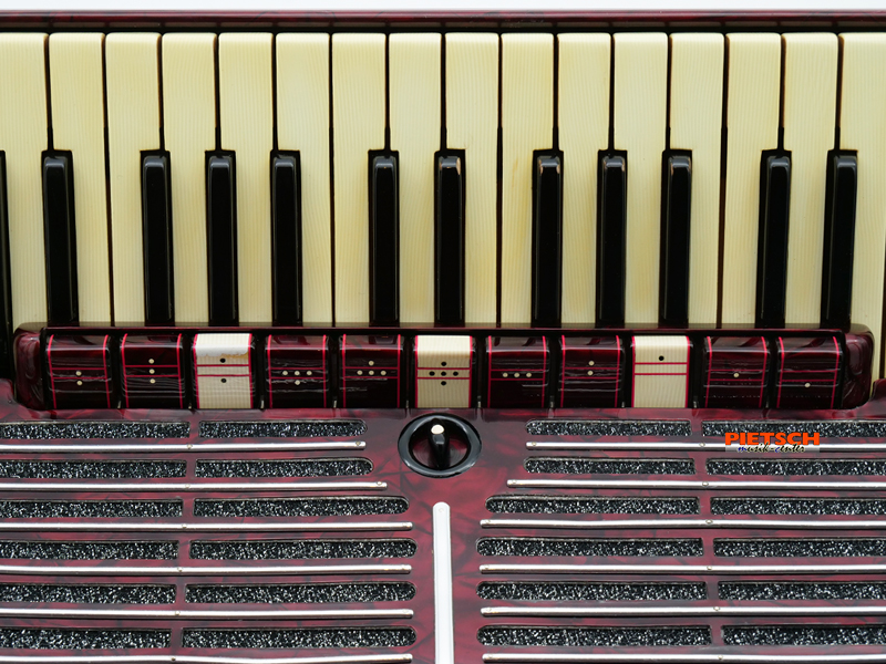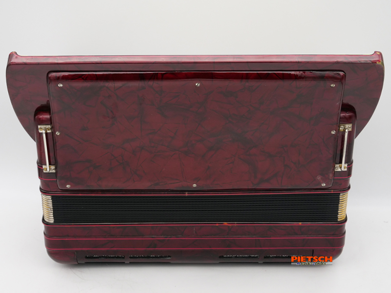 Piano Akkordeon, Farbe: Rot, Gebraucht, Mit Cassotto, inkl. Limex Mikro System, 41 holzgelagerte Tasten, Chöre im Diskant: 5, 11 Diskantregister, Stimmung (16″+8″+8″+8″+4″), 127 Bässe, Chöre im Bass: 5, 5 Bassregister, Maße in cm: ca. 48 x 18,5