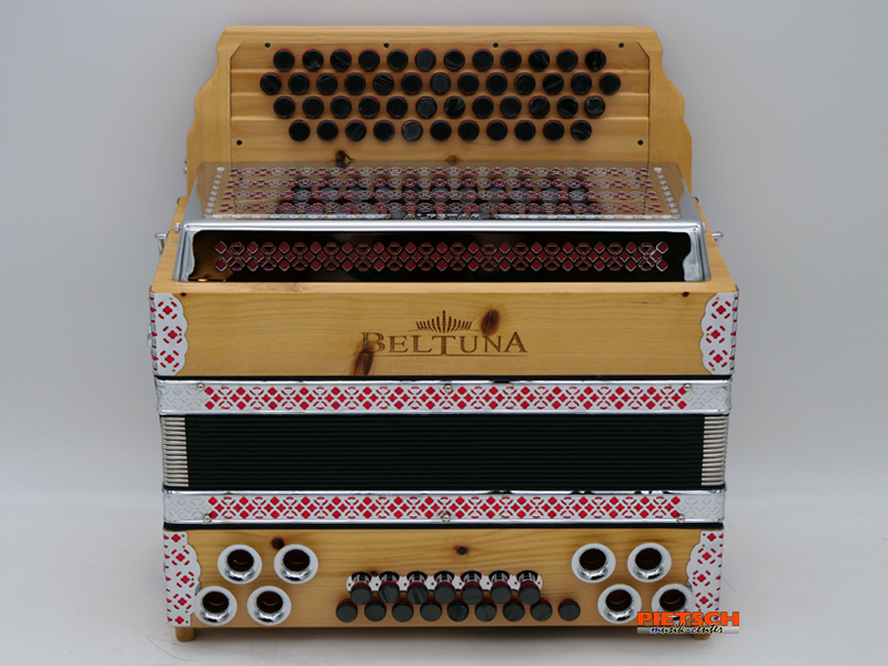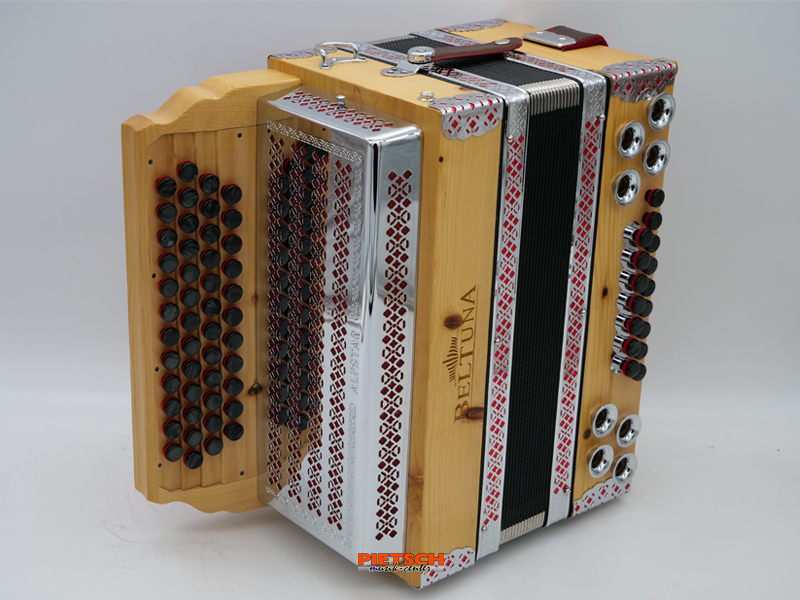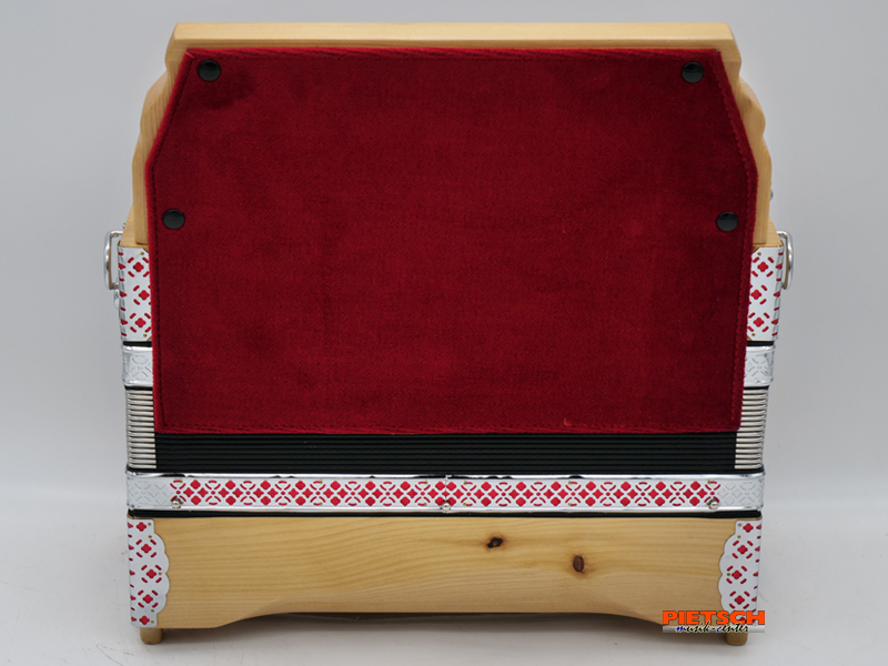 Steirische Harmonika, Stimmung: B-Es-As-Des, Farbe: Zypresse, 4-reihig, 48 Diskantknöpfe, inkl. 2 Halbtöne, 3-chörig, 16 Bassknöpfe inkl. X-Bass + H-Bass, inkl. 2 Mollbässe auf Zug, Super Dural Stimmplatten, Maße in cm: ca. 38 x 20
