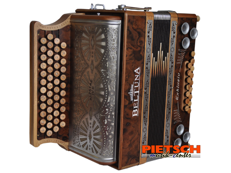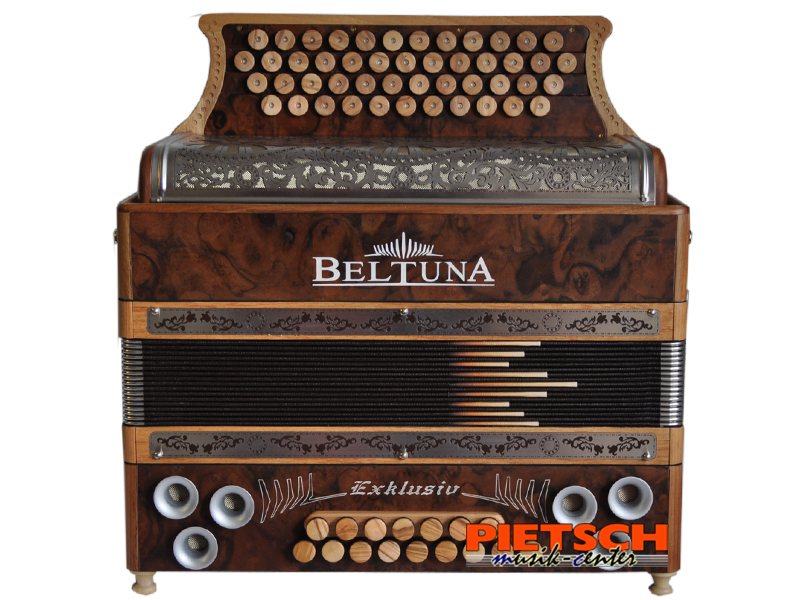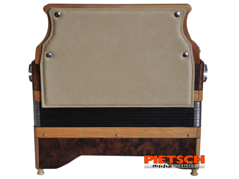 Steirische Harmonika, Gebraucht, Top Zustand, Stimmung: G-C-F-B, Farbe: Nussbaumwurzelholz, 4-reihig, 48 klingende Melodieknöpfe, 3-chörig, 16 Bassknöpfe inkl. X-Bass + H-Bass, inkl. 2 Mollbässe auf Zug, inkl. Luxe Pro – Stimmplatten