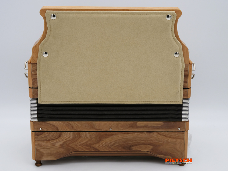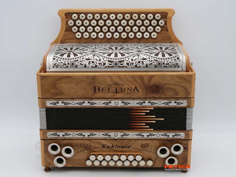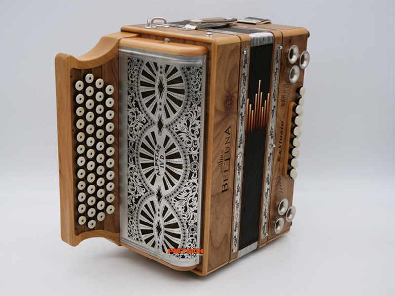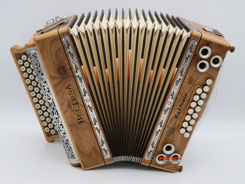 Steirische Harmonika, Stimmung: G-C-F-B, Farbe: Ulmenwurzelholz, 4-reihig, 48 klingende Melodieknöpfe, 3-chörig, 16 Bassknöpfe inkl. X-Bass + H-Bass, inkl. 2 Mollbässe, Luxe Pro – Stimmplatten, inkl. Halbtöne in erster und zweiter Reihe
