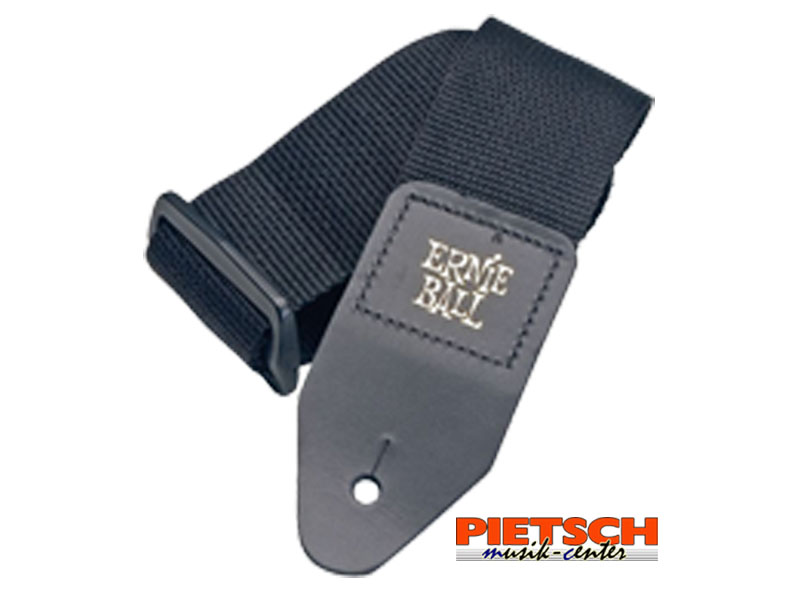 Das Ernie Ball Original. Polypro Gurt. 5 cm breit, keine Metallteile, Farbe blutet nicht aus. Leder-Enden mit Ernie-Ball-Logo, Farbe: schwarz, Maximale Länge: 1,80 m