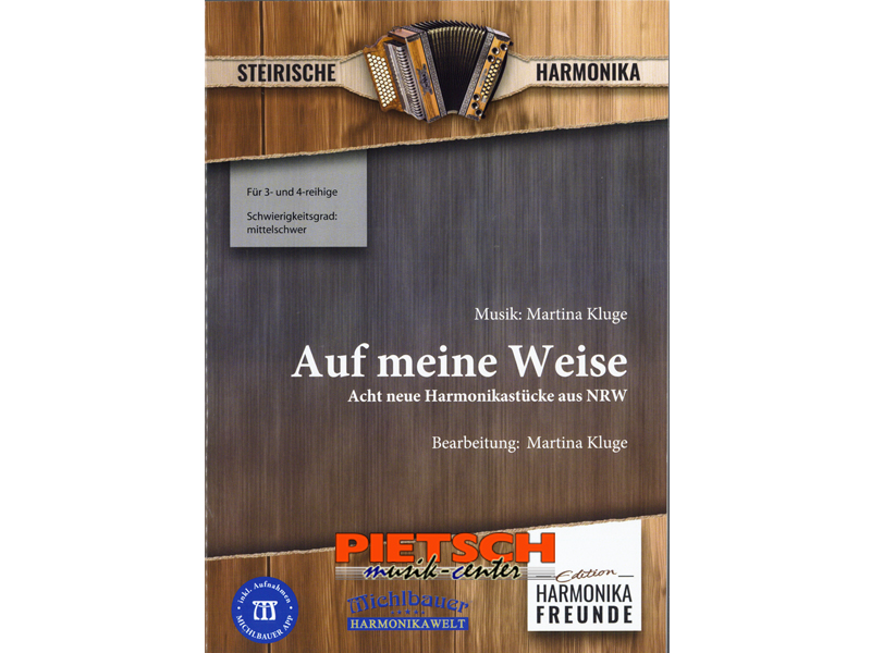 Spielheft für Steirische Harmonika zum Download Bearb.: Martina Kluge für 4- reihige Harmonika mit Moll und Halbtöne inkl. Aufnahmen in der Michlbauer APP Erschienen in der Edition Harmonikafreunde Auf meine Weise – Acht neue Harmonikastücke aus NRW